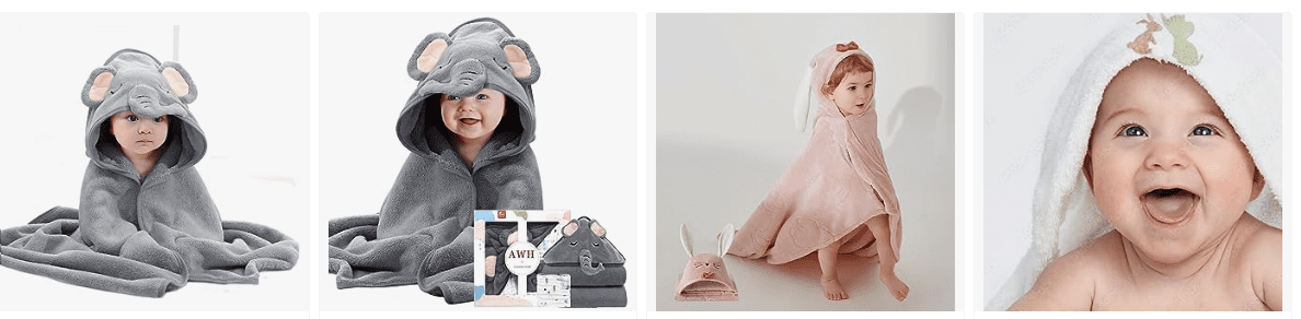 • Bath & Hooded Towels- Baby bath towels with hood helps you keep babies head warm. These baby towels can be used after bath, beach or pool. Cute animal design add more fun to babies bathing time.