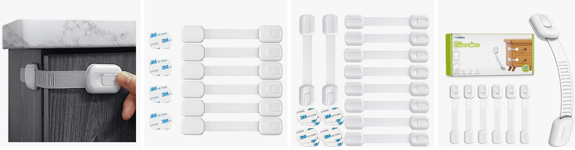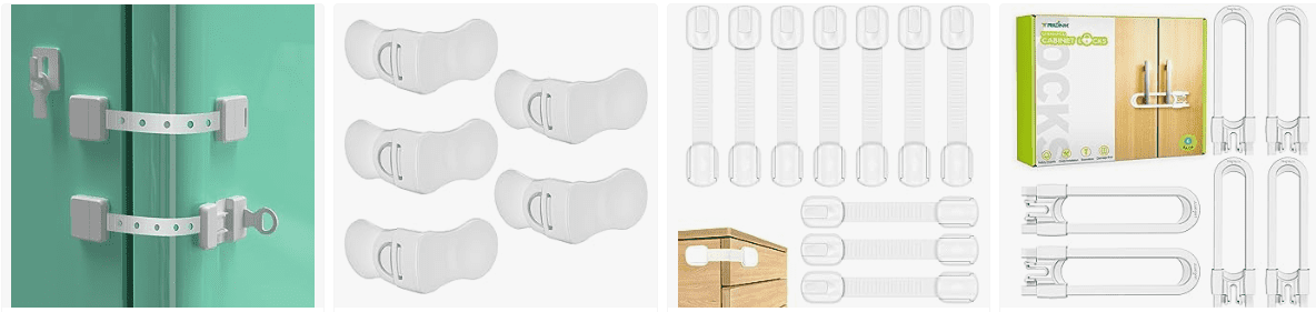 - Child safety cupboard locks | Whether it's the kitchen, bathroom, nursery, or living room — these child safety locks for cupboards and doors are designed to protect every corner of your home. From baby cupboard safety locks to drawer locks for baby safety, the adjustable design ensures a snug fit on cabinets, drawers, doors, and more, helping protect little explorers.